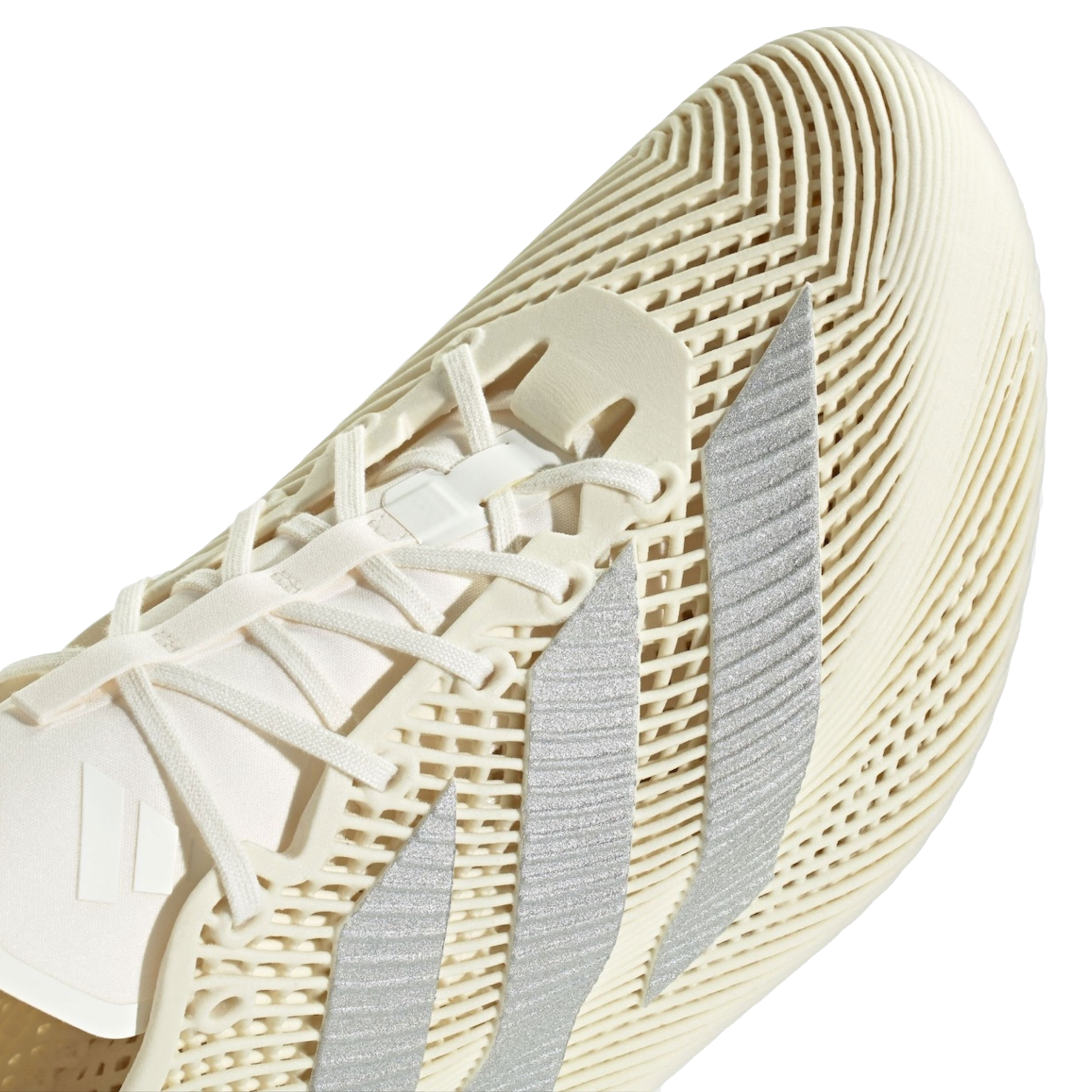 The pair swaps stitched panels for a continuous lattice that wraps from toe to heel. Layered, wave-like striations create depth through shadow and spacing rather than overlays. Three metallic Silver stripes sit slightly raised across the midfoot, their ribbed texture contrasting with the matte Off-White cage beneath. Flat cream laces pass through molded eyelets that appear to grow directly from the structure.