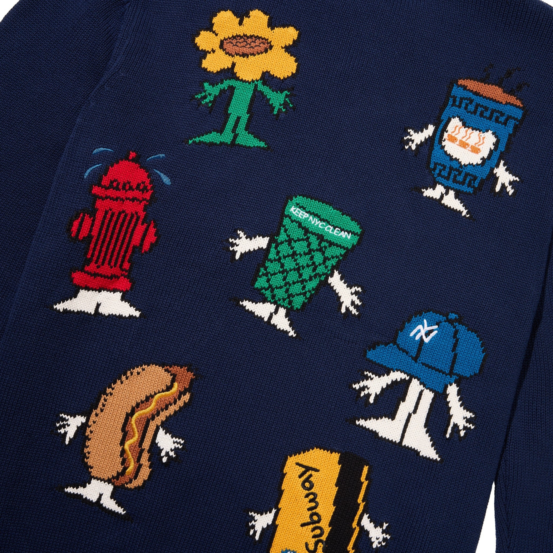 Intarsia knit graphics and embroidered details on back.