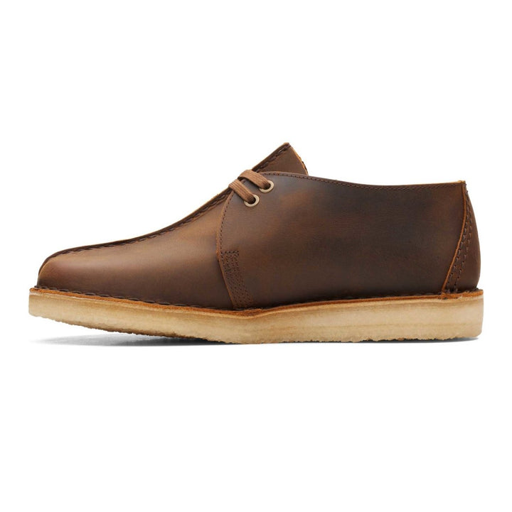 First introduced in the 1970s, this Clarks Originals lace-up is designed on a unique comfort shape last. The beeswax brown leather upper features a leather heel piece with the Trek man emblem. Staple features also include the central butt seam and crepe sole.